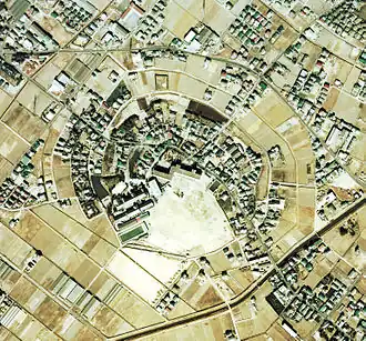 The current layout of Tanaka Castle dates from the period of Takeda rule. As there was no limitation due to geography, the fortifications consisted of three concentric circular moats, each with four gates equipped with a "maru umadashi" style gate, itself surrounded by crescent-moon shaped moats. The outer moat had a diameter of 300 meters.