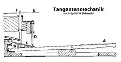 In 1440, Arnault de Zwolle described what is believed to be the first keyboard instrument which used a tangent action.[1] The earliest surviving instrument with a tangent action is a spinet built by Francesco Bonafinis with its jacks replaced with wooden tangents before 1700.[2] Jean Marius proposed a design for a hammered instrument similar to a tangent piano in 1716, though it was only published after his death in 1735.[3] Christoph Gottlieb Schröter claimed that he had invented the tangent piano in 1717. Franz Jakob Späth presented a tangent piano to the elector of Bonn in 1751.[4]