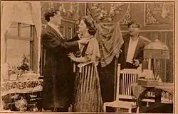 Tangled Lives is a 1910 American silent short drama produced by the Thanhouser Company.[1] The plot focuses on, John Hill, a bank cashier who decides to fakes his death after the manager finds his accounts are short. Before he can go through with the plan, a reporter interviews the wife, May, and decides to suppress the story because he has become infatuated with her. Five years pass, May and the reporter decide to marry, but John returns on the day of the wedding. Upon sneaking into the house, he sees their love and decides to disappear. As he attempts to leave he accidentally falls to his death and the reporter removes his body before he leads May to the altar. The film was described as a variant of Enoch Arden by one reviewer, but it differs in its execution. The cast and credits of the film are unknown, but a surviving film still shows the principal characters. The film was released on September 13, 1910, to positive reviews. The film is presumed lost.