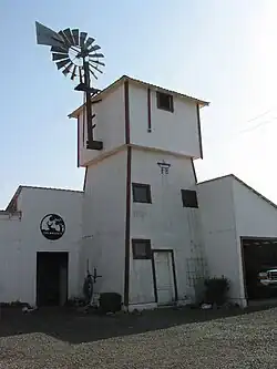 In California, several types of tankhouse can be seen today. The supporting tower may have vertical or sloping sides. The tankroom (top floor) may also have vertical or sloping sides, and may or may not overhang the tower. On many tankhouses the redwood tank is not enclosed by siding but exposed, with or without a roof above it. In some areas one type predominates. Other variants occur, particularly among those built in the 19th century. Cooper illustrates four early examples with octagonal towers.[4] Pitman includes drawings of six types,[5][6] one of which is now rare, with the supporting structure wider than the tankroom. Manning includes drawings of five types, including the same rare type.[7] Thorsheim also illustrates five types.[8] Many tankhouses have lost the top (tank) level, making it hard to know the original design. Windmills were usually attached to the tankhouse, but sometimes were on their own tower. Most of the windmills have disappeared.