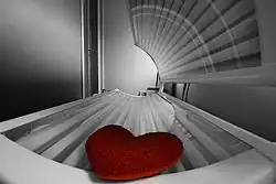 When the tanning bed was implemented, the concept of tanning changed yet again. The first self-tanner, Tan-Man, was introduced in 1959, and UV tanning beds started to appear in the United States in 1978.[24] A study conducted at Pepperdine University in 2005 found that 25 percent of beach-goers showed signs of tanning addiction or tanorexia.[25] Since the implementation of tanning beds in the United States, nearly 30 million people tan indoors every year.[26]