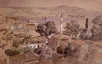 It was noted as a Greek village in the 17th century, but around a hundred years a few Armenians and Muslims also lived there. Over time, it became a tiny fishing village inhabited almost completely by Orthodox Christians. The village became the centre of the Terkos Metropolis in 1655,which transformed the village. Thanks to its new religious position and relative proximity to Constantinople, it became one of the most important settlements on the European side of the Bosphorus. Due to its great climate and safety from diseases such as Cholera, many members of the Greek aristocracy moved their place of residence here. Many foreign embassies and merchants also started to move here, and became the favourite place of the ruling Greek elite. Some Greek families kept their property here until the Greek war of Independence in 1821, after which they were confiscated. The town remained mostly Greek until around the middle of the 20th century. During the Istanbul pogrom, a church built in 1796 and the metropolitan residence was put to fire. During the following years, due to the worsening Turkish-Greek relations and the invasion of Cyprus, most Greeks were forced to move out.[5] The Greek school was closed down in 1985. Around this time, around 50 Greeks -mostly elderly- lived in Tarabya.[6]