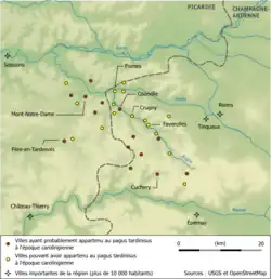 In the Middle Ages, it became a county (comitatus) under the Carolingians, subject to visits by missi dominici (lord's envoys). It is mentioned in 853 as the pagus tardinisus. The border between the dioceses of Soissons and Reims ran through it. In 858, King Charles the Bald appointed a certain Northmannus, possibly a former Viking, as count in the Tardenois. He was still count in 868, when he got into a conflict with the Bishop Hincmar of Laon that was settled by the king in his favour.[1] Hincmar, archbishop of Reims, records around 870 that the Tardenois was under a count named Bertram, a relative of his, who exercised the bannum and held placita. The Tardenois was at that time a typical Carolingian county.[2]