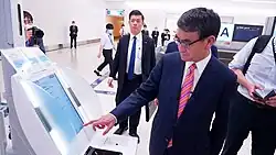 Taro Kono (河野 太郎, Kōno Tarō; born 10 January 1963) is a Japanese politician who served as the Minister for Digital Transformation from 2022 to 2024. A member of the Liberal Democratic Party (LDP), he previously served as Minister for Administrative Reform and Regulatory Reform from 2015 to 2016 and from 2020 to 2021, and was the Minister for Foreign Affairs and Minister of Defense under Prime Minister Shinzo Abe. He is also a member of the House of Representatives representing Kanagawa's 15th district since 1996.