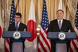In January 2020, Kono stated that "Japan and the United States should speed up efforts to resolve the issue of undelivered and unsettled arms purchases", referring to the Aegis Ashore system[27] Speaking at the Center for Strategic and International Studies, Kono celebrated the 60th Anniversary of the U.S.–Japan Alliance on 14 January.[28]
