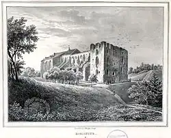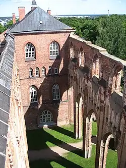 The church was originally planned as a basilica, but the later addition of the three-aisled quire gave it the character of a hall church. The quire (in an early form) and nave were already in use by 1299. About 1470 the high quire with its pillars and arches was completed in Brick Gothic style.[1] The cathedral was completed at the end of the 15th century with the building of the two massive fortress-like towers on either side of the west front. The height of the stone parts of the towers without spires was 66 meters. The exact height of the towers with spires is unknown, the French traveler and writer Aubry de La Mottraye, who visited Tartu in 1726, mentioned that "the towers were at least as high as the towers of Notre-Dame de Paris".[2] A wall separated the cathedral grounds and the bishop's fortified residence from the lower town.