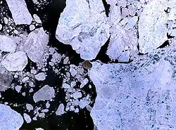 The ship was tied to a large floe, and drifted slowly down the channel with the pack; about noon, she was quite near Hans Island and west of it. The latitude by observation was 80°48′ N; longitude 68°38′ W. The ship continued to drift, and at 7 p.m. was midway between Hans and Franklin Island, which are ten miles.[a]