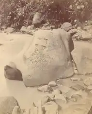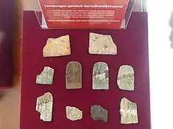The earliest known written records of Tarumanagara's existence were inscribed in stone inscriptions.[5] Inscribed stone is called prasasti in Indonesian. Numbers of stone inscriptions dated from Tarumanagara period were discovered in Western Java region.