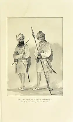 ![]() Illustration titled 'Guru Govind Singh’s armed disciples, the early soldiers of the Khalsa' from The Sikhs (1904) by John James Hood Gordon | |