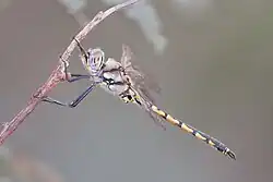 The tau emerald is a medium-sized, black and yellow dragonfly with long legs,[4] reaching a body length of about 50 mm.[5] As is unique to dragonfly and mayfly species, H. tau has flight muscles attached directly to the wings,[6] and in both the males and females the inboard edge of the hindwing is rounded.[4] The 7th abdominal tergum is extensively black above and yellowish at the sides.[7] The top of the frons are yellow with a dark T-mark.[8] The species exhibits a linear relationship between head width and body length. [9]