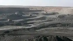 The Ukhaa Khudag section of Tavan Tolgoi deposit covers an area of 2,960 ha and has reserves of 581 million tonnes.[3][27] It is owned and mined by the Mongolian Mining Corporation (formerly Energy Resources LLC); they were granted a mining license in August 2006, and began mining in April 2009.[9] MMC has contracted Leighton Asia to conduct mining operations at the site.[28] Production at the mine has increased to 2.1 million tonnes in the first quarter of 2012.[29] MMC constructed a road from Ukhaa Khudag to the Gashuun Sukhait border crossing (finished in October 2011). The road charges other mining companies a fee for use - there are now concerns that trucks are avoiding the toll and driving parallel to it, causing erosion and pollution issues.[30]