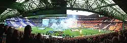 Banner and card display by fans of St Johnstone (left) and Dundee United (right) at the 2014 Scottish Cup Final | |