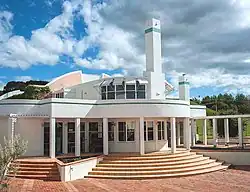 Under the direction of the Buck and Morris families the Te Mata Estate winery complex was modernized and extended in the 1980s by New Zealand architect Sir Ian Athfield. An underground barrel hall, cuverie and office buildings were added in the region's prominent Art Deco and Spanish Mission architecture as deliberate influences.[6] Opposite the winery, the distinctive Coleraine House is a private residence that has gained much recognition as a significant work of New Zealand architecture.[7] In 1997 it appeared on the 80c postage stamp in a series celebrating New Zealand wines.[8]