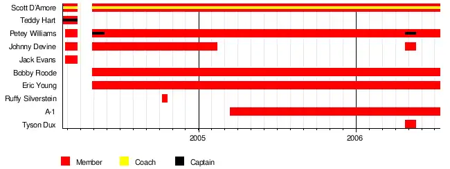 The original team was composed of Teddy Hart as team captain, with Jack Evans, Johnny Devine, and Petey Williams as his teammates. When the World X-Cup was announced, the team was revamped to add power to the speed and agility in the previous incarnation of the team. Petey Williams would replace Hart as team captain, Johnny Devine would remain on the team, and Eric Young and Bobby Roode would be added to the team. The team made it to the Ultimate X finals, but lost to Team USA (Jerry Lynn, Chris Sabin, Christopher Daniels and Elix Skipper).