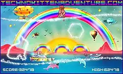 In the game, the player navigates a kitten powered by a jetpack or by other methods with a single-button control.[2] In the original Xbox Live Indie Games version the controls were limited to one button which players held to make the cat ascend, and released to make him descend.[3] The object of the game is to accumulate a high score by avoiding black boxes and parameters on the top and bottom of the screen. The black lines change color in time with the intensity of the music, turning into rainbow-patterned lines. The other objects on the screen, including party yachts, unicorns, stars and hands, are intended to distract the player from their main objective of avoiding lines; flying through these objects will not affect the player's score. When the player does hit a black or rainbow line, the kitten character explodes in a spray of sparkles and emits a signature "Meow" sound effect.[4]
