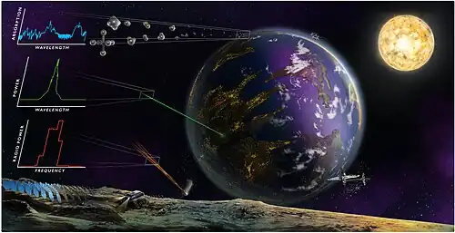 Technosignature or technomarker is any measurable property or effect that provides scientific evidence of past or present technology.[1][2] Technosignatures are analogous to biosignatures, which signal the presence of life, whether intelligent or not.[1][3] Some authors prefer to exclude radio transmissions from the definition,[4] but such restrictive usage is not widespread. Jill Tarter has proposed that the search for extraterrestrial intelligence (SETI) be renamed "the search for technosignatures".[1] Various types of technosignatures, such as radiation leakage from megascale astroengineering installations such as Dyson spheres, the light from an extraterrestrial ecumenopolis, or Shkadov thrusters with the power to alter the orbits of stars around the Galactic Center, may be detectable with hypertelescopes. Some examples of technosignatures are described in Paul Davies's 2010 book The Eerie Silence, although the terms "technosignature" and "technomarker" do not appear in the book.