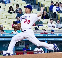 Lilly returned for spring training in 2013 but lost time due to illness and rainouts so he was unable to build up arm strength.[33] He started the season on the disabled list, and made several rehab appearances in the minors.[34] After injuries to starters Zack Greinke and Chris Capuano, Lilly was activated off the disabled list and returned to the rotation on April 24.[35] He made 2 starts and then returned to the DL on May 3 with a strained rib cage muscle.[36] He returned again on May 20[37] and he made 3 more starts before injuring his neck when he was bumped into by Kyle Blanks of the San Diego Padres in a game on June 4,[38] which led to him returning to the disabled list.[39] After a few more rehab starts, Lilly claimed he was having trouble recovering after starts and that he wanted to work out of the bullpen after his return from the DL.[40] However, the Dodgers instead designated him for assignment on July 25[41] and released him on August 2.[42]