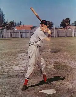 Williams played back-up behind Vince DiMaggio and Ivey Shiver on the (then) Pacific Coast League's San Diego Padres. While in the Pacific Coast League in 1936, Williams met future teammates and friends Dom DiMaggio and Bobby Doerr, who were on the Pacific Coast League's San Francisco Seals.[19] When Shiver announced he was quitting to become a high school football coach in Savannah, Georgia, the job, by default, was open for Williams.[20] Williams posted a .271 batting average and 11 runs batted in (RBI) on 107 at bats in 42 games for the Padres in 1936.[20][21] Unknown to Williams, he had caught the eye of the Boston Red Sox's general manager, Eddie Collins, while Collins was scouting Doerr and the shortstop George Myatt in August 1936.[20][22]