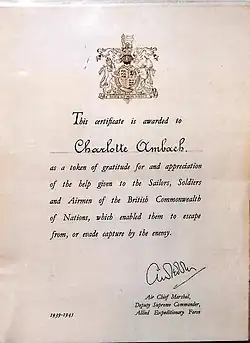 A committee of the MI9 escape organisation was responsible for drawing up an initial list of potential recipients, vetting applicants and authorising the awards to deserving foreign citizens.[1] The committee was headed by Donald Darling, who had headed the MI9 branch in Gibraltar during the war.[2] Some recommendations came via the Royal Air Force's (RAF) Missing Research and Enquiry Service.[3] This organisation worked from 1944 to 1952 to determine the fate of missing RAF personnel and to locate their graves across Europe.[4] MI9 processed more than 35,000 claims from Western Europe in two years alone and also awarded compensation and expenses where applicable. Care was taken to weed out fraudulent claims, particularly from those who had collaborated with Axis occupiers and were now seeking recognition from the Allies as a means of avoiding persecution.[2]