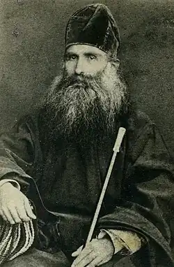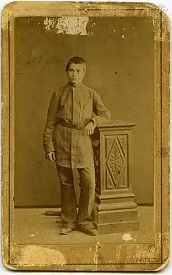 Admission to Martvili Spiritual School required fluency in Georgian literacy. That's why Timote Sakhokia sent his son to priest Shio Iosava, with whom Tedo lived for nearly a year but still couldn't learn to read or write in Georgian.[4] Tedo Sakhokia was admitted to the Martvili Spiritual School in 1877, but due to his lack of Georgian literacy, he was placed in the first preparatory class. Tedo Sakhokia lived in Ivane Odisharia's home, where Besarion and Giorgi Khelaia also resided. Tedo was taught to read and write in Georgian by Besarion (later the Catholicos-Patriarch of All Georgia Ambrosius Khelaia).[1] While Tedo Sakhokia was in school, Vasil Barnov also taught him.[5]