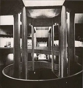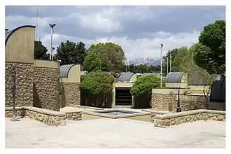 The museum was designed by Iranian architect and cousin of the empress, Kamran Diba, who employed elements from traditional Persian architecture of Yazd, Kashan, and other desert towns.[7][8] Diba collaborated with architect Nader Ardalan during the design phase.[2] It was built adjacent to Farah Park, renamed Laleh Park after the Islamic revolution, and was inaugurated in 1977.[9] The building itself can be regarded as an example of contemporary art, in a style of an underground New York Guggenheim Museum.[10] Most of the museum area is located underground with a circular walkway that spirals downwards with galleries branching outwards.[10] Western sculptures by artists such as Ernst, Giacometti, Magritte, and Moore can be found in the museum's gardens.[10][11]
