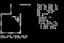In Telengard, the player travels alone through a dungeon fraught with monsters, traps, and treasures in a manner similar to the original Dungeons & Dragons.[1] The game has 50 levels with two million rooms, 20 monster types, and 36 spells.[a] It has no missions or quests, and its only objective is to survive and improve the player character.[3] The game is set in real-time and cannot be paused,[3] so the player must visit an inn to save game progress. In the early releases such as Apple II, the game world has no sound and is represented by ASCII characters, such as slashes for stairs and dollar signs for treasure.[1] Unless the player enters a special cheat code, progress is lost upon dying.[1]