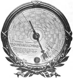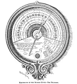 The teleseme had a dial roughly the size of a dinner plate, with written options arranged in concentric circles.[4] Teleseme models offered a varying number of options (137 choices in one model, 140 in another). To operate the teleseme, the hotel guest would move the hand of the pointer to the desired service. Once the guest had set the dial, they would push a button which closed the circuit and alerted a hotel employee through an electrolytic annunciator.[5]