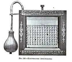 An attendant in the hotel office would monitor an electrolytic annunciator, a small glass display around 8 in × 12 in (200 mm × 300 mm) with up to 400 numbered compartments, each holding a platinum disc in a liquid suspension beneath the number.[6] A red spot would appear on the platinum disc, and the discoloration would indicate which room had requested service. The attendant would note the room number and squeeze a bulb that would force air into the liquid and clear the red spot.[4] The attendant would then use their own teleseme to mimic the setting from the one in the hotel room and determine the order.[6]