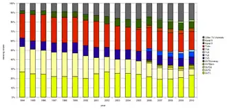 | TV3 | 10 | 11 | 11 | 11 | 10 | 10 | 10 | 10.5 | 9.4 | 9.3 | 8.8 | 8.4 | 8.1 | 7.2 | 6.4 | 6.2 | 7.2 | 5.0 | 5.7 | 3.8 | 4.4 |