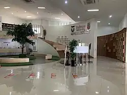 The Technical Implementation Unit (UPT) of the Telkom University Library which is located on the 3-4-5 floor of the Learning Center Building is one of the supporting facilities in providing various information to carry out the Tri Dharma of the university. The Telkom University library is developed as a Knowledge Management Center where there are curricular library collections, research-supporting library collections, general insight and literature collections, national literature collections, global insight library collections and others, with the number of library titles and the minimum number of collections following the provisions of the National Higher Education Standards (SNPT).[31][32]