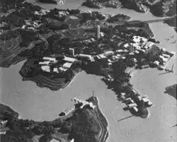 Log buildings along a reservoir shoreline