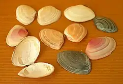 Bivalves are molluscs with a body compressed between two usually similar shell valves joined by an elastic ligament. There are teeth at the edge of the shell and the animal has a muscular foot, gills, siphons, mouth and gut and is surrounded by a mantle inside the shell.