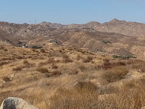 The Temescal Mountains were originally named by the Spanish as Sierra Temescal (perhaps from the nearby Rancho Temescal), a name which appears on the Rail Road Route survey map made by the U. S. Army Pacific Railroad Surveys in 1854–55.[3] The Temescal Mountains are one of the northernmost of Peninsular Ranges of California, running from the south side of the Santa Anna River, southeast nearly parallel with the Santa Ana Mountains, from which it is separated by the Temescal Valley and Elsinore Valley sections of the Elsinore Trough. The Temescal Mountains were originally considered to be bounded on the south by the San Jacinto River, by J. D. Whitney in his 1865 Geological Survey of California.[4] A later study by Rene Engel, considers the Sedco Hills and the other mountains that extend to the southeast of the San Jacinto River east of Lake Elsinore and north of the Temecula Basin, in Murrieta to be part of the same range forming the natural continuation of the mountains.[5] The Murrieta Hogbacks are the southeasternmost heights of the range, overlooking the Warm Springs Creek Canyon.