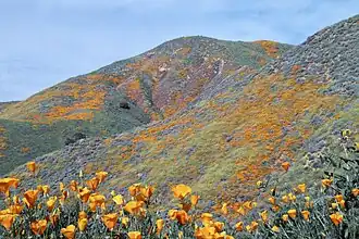 As part of the California Floristic Province, the Temescal Mountains host a diverse array of plant species within distinctive natural (plant) communities, including coastal sage scrub, chaparral, riparian woodland, southern oak woodland, rocky outcrop and valley grassland. Rare flowers like the intermediate mariposa lily, grow there. Fragrant sages, evergreen shrubs and trees, perennial bunchgrasses, Dudleya species of succulents, fire-following flowers and other wildflowers adorn the terrain.