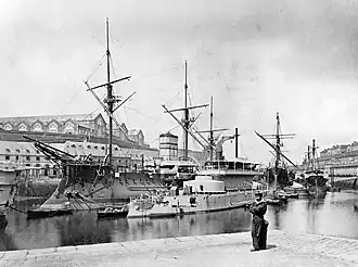 ![]() Tempête fitting out c. 1878, behind her is the ironclad Redoutable