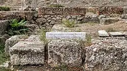The current temple is the second structure on the site. It is located on the west side of the Agora, beneath the Kolonos Agoraios (Agora hill) and the Temple of Hephaestus. The Stoa of Zeus is located immediately to the north. To the south was an open space and then the Metroon. The space to the east was open, until the Roman period, when the Temple of Ares was built there.[1] The identification of these archaeological remains as the Temple of Apollo Patroos was initially based on the account of Pausanias, who mentions the temple after the Stoa of Zeus and before the Metroon.[2]