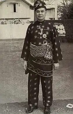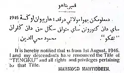 Tengku Mahmood Mahyideen publicly renounced the title 'Tengku' (Prince) for himself and his descendants through a local newspaper on 25 September 1946.[17] He did not state the reason behind this decision. However, several sources associate it with his disappointment over broken British promises to liberate Patani.[b] Some sources also suggest that he was disillusioned by the formation of the Malayan Union. Following this, Tengku Mahmood Mahyideen was referred to in newspapers simply as 'Inche'[18] or 'Che'.[19]
