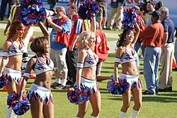 Cheerleaders cheering on the crowd during a home game.