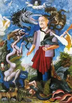 Ociepka saw his painting as God's mission, and so tried to portray absolutist themes, including the struggle between good and evil. Ociepka felt that he had not just the gift of seeing and portraying the world in a particular way, but also the "moral responsibility" to share this vision with the world.[7] Many of his paintings are also heavily influenced by Rosicrucian ideology, though, in addition to his esoteric focus, he was also heavily inspired by Catholic and Silesian thinking.[8] He strongly opposed materialism, seeing it as a force of evil in sharp contrast with his religiously inspired way of seeing the world.[9]
