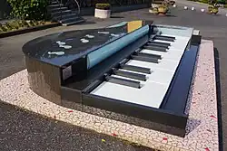 According to Teng's maiden name character, Yun, the grave was named "Yun Yuan".[71] The gravesite features a golden-colored, life-size statue of her, and a large electronic piano keyboard set in the ground that can be played by visitors who step on the keys. On the tombstone, the head of Teng is carved. The coffin lid behind the tombstone is polished with black marble. Behind the coffin lid is a stone sculpture. The upper half is a lying portrait of the singer, and the right side of the lower half is inlaid with a color photo of her, with the words "Deng Lijun, 1953–1995" written on the left side. On the right side of the coffin lid, there is a huge stone with the words "Yunyuan" inscribed by James Soong, Governor of Taiwan Province. On the left side of the coffin lid, there is a stone stele on which is engraved with the epitaph: "Here lies a superstar who dedicated her life to singing." The memorial is often visited by Teng's fans.[17]
