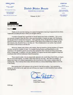 Letter from Senator Orrin Hatch, first elected in 1976, expressing reservations regarding term limits (dated February 10, 2011)