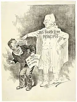 In the 1780s, about half the states provided term limits for governors.[26] The Constitutional Convention of 1787 discussed the issue and decided not to institute presidential term limits. "The matter was fairly discussed in the Convention," Washington wrote in 1788, "and to my full convictions [...] I can see no propriety in precluding ourselves from the services of any man, who on some great emergency shall be deemed universally, most capable of serving the Public," even after serving two terms. The Constitution, Washington explained, retained sufficient checks against political corruption and stagnant leadership without a presidential term limits provision.[27] Jefferson, however, strongly endorsed a policy of term limits. He rejected calls from supporters that he run for a third term in 1808, telling several state legislatures in 1807–1808 that he needed to support "the sound precedent set by [his] illustrious predecessor."[25]