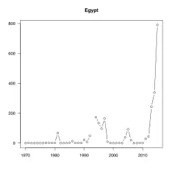 Terrorism in Egypt in the 20th and 21st centuries has targeted the Egyptian government officials, Egyptian police and Egyptian army members, tourists, Sufi Mosques and the Christian minority. Many attacks have been linked to Islamic extremism, and terrorism increased in the 1990s when the Islamist movement al-Gama'a al-Islamiyya targeted high-level political leaders and killed hundreds – including civilians – in its pursuit of implementing traditional Sharia law in Egypt.[43]
