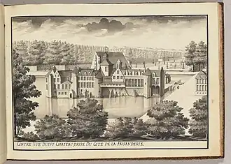 In the same period, the area was significantly expanded, including part of the hamlet of Goordal and the old banmolen of the dukes of Brabant, also known as the "Spanish house".[2] In 1625–1632, the wooden palisade was replaced by a seven kilometres long brick wall with ten gates, of which important remains are still preserved.[2] A painting by Jan van der Heyden dating from around 1700, with a view of the castle from the south, shows the wall on the west side of the Warande with the Leuvensepoort on the right.[2]