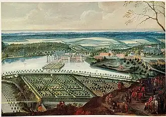 To the right of "het Hoefijzer", on the south side, a spacious orangery and a botanical garden were planted, with a large dog kennel a little further on; on the left, on the north side, a vegetable garden surrounded by a falconry, a silkworm farm and a pheasant farm.[1][2] To the south of the castle, a terraced pleasure garden was created, embellished with fountains, vases, statues, a labyrinth, toys, a bathing pond with artfully painted Chinese pavilions, a cascade, an aviary for exotic birds, all connected by steps and leafy tree galleries.[1][2]