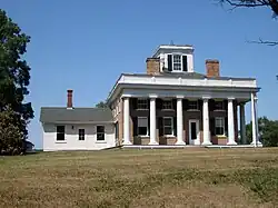 The two-story house is square, with entrances on the east, south, and north. The house is built on a foundation of fieldstone and locally produced soft red brick. The east facade features two windows flanking the door and four regularly spaced windows on the second floor. The doors on the north and south are off center, with three windows on each side — one to the east and two to the west. The walls are built with the same soft red brick as the foundation. The Greek Revival porch dominates the southern, eastern, and northern facades with large Doric columns. The roof is hipped with a slight pitch. A cupola is at the center of the house; it is large enough to serve as a bedroom. A kitchen extension was constructed at the rear on the west side in the 1890s.