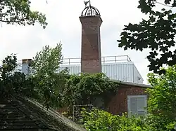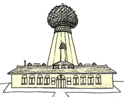 The Tesla biographer John Joseph O'Neill noted the cupola at the top of the 186-foot tower had a 5-foot hole in its top where ultraviolet lights were to be mounted, perhaps to create an ionized path up through the atmosphere that could conduct electricity.[25] How Tesla intended to employ the ground conduction method and atmospheric method in Wardenclyffe's design is unknown.[26] Power for the entire system was to be provided by a coal fired 200 kilowatt Westinghouse alternating current industrial generator.