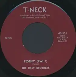 "Testify" is an uptempo soul song by the American rhythm and blues group the Isley Brothers. Written by the Isleys[1] and recorded in 1964, it followed several successful singles by the group and was the first single to appear on their own T-Neck record label.[2]