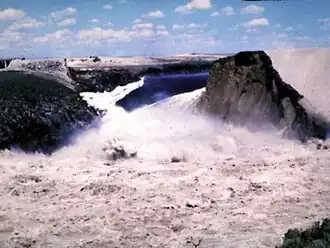 The eastern Snake River Plain is almost entirely underlain by basalt erupted from large shield volcanos on top of rhyolitic ash-flow tuff and ignimbrites.[10] The tuff, a late-Cenozoic volcanic rock, is 1.9 million years old. The dam site is composed of basalt and rhyolite, both of which are considered unsuitable for dam construction because of their high permeability. This was confirmed by long-term pump-in tests at rates of 165 to 460 US gal (620 to 1,740 L) per minute.[11] Test cores, drilled by engineers and geologists employed by the Bureau of Reclamation, showed that the canyon rock at the dam site is highly fissured and unstable, particularly on the right side (as one faces the direction of flow). The widest fissures were determined to be 1.7 inches (4.3 cm) wide. The bureau planned to seal these fissures by injecting grout into the rock under high pressure to create a grout curtain in the rock.
