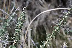 This shrub or subshrub has a stiff, branching network of stems reaching up to 1.2 meters in maximum height. Like other Tetradymia, this species has two types of leaves. The larger, primary leaves become spines which may be over 2 centimeters in length. The inflorescence is made up of a few flower heads, each of which contains four bright yellow flowers. The fruit is well over a centimeter long, including its large pappus.[2][3] The leaves fall off the plant during dry times. Also when it is dry the plant may not flower, or if it does, it does not produce fruits.[2]